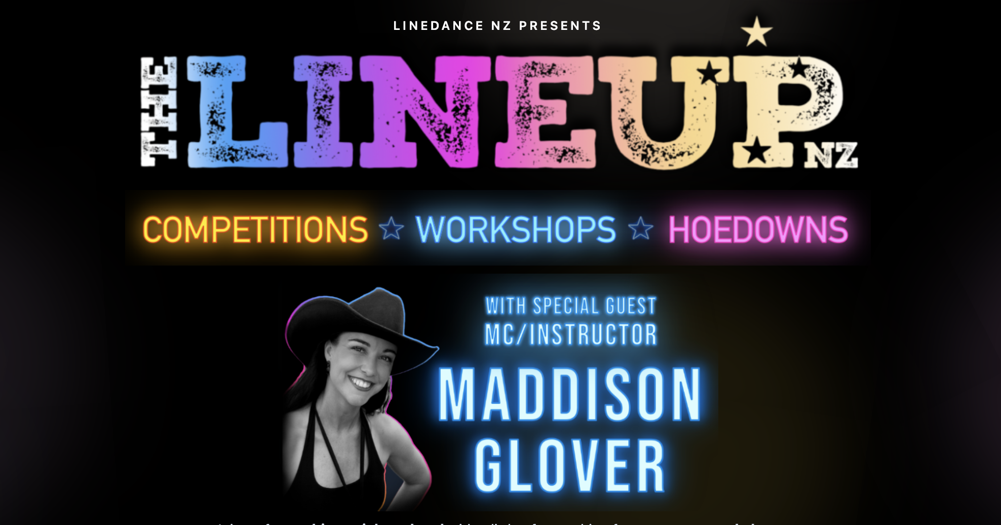 Join Donna for Linedance NZ’s big social weekend with a little of something for everyone - workshop, competitions, and non-stop hoedown party energy. Dance alongside people from all over NZ and beyond, and enjoy sessions with our special guest MC and workshop instructor, Maddison Glover.